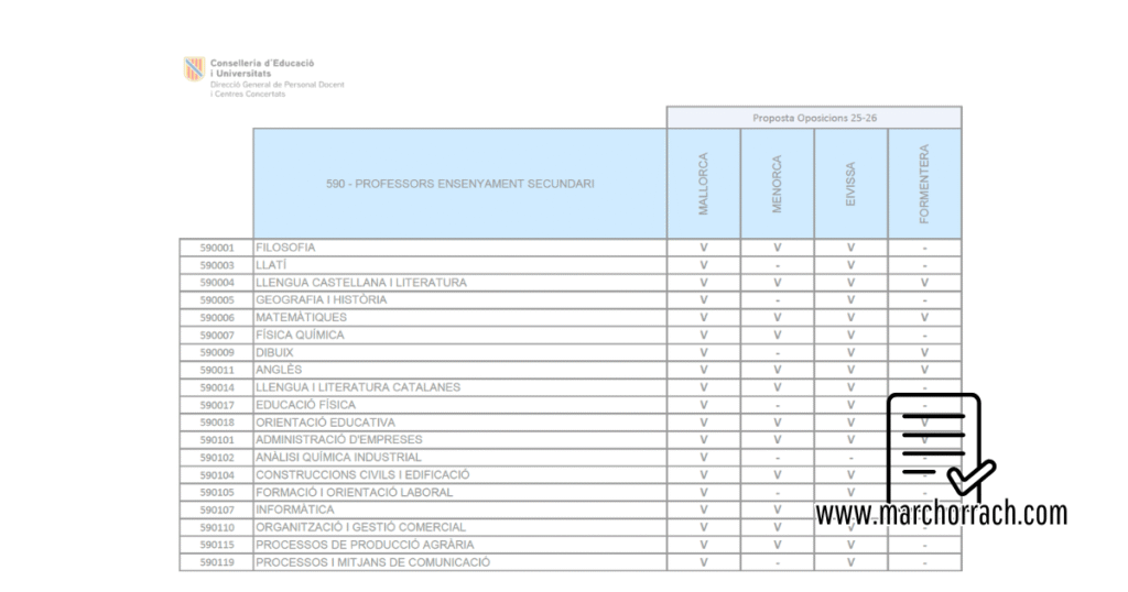 - Especialitat d鈥橢ducaci贸 F铆sica (0590017): convocada provisionalment a les illes de Mallorca i Eivissa